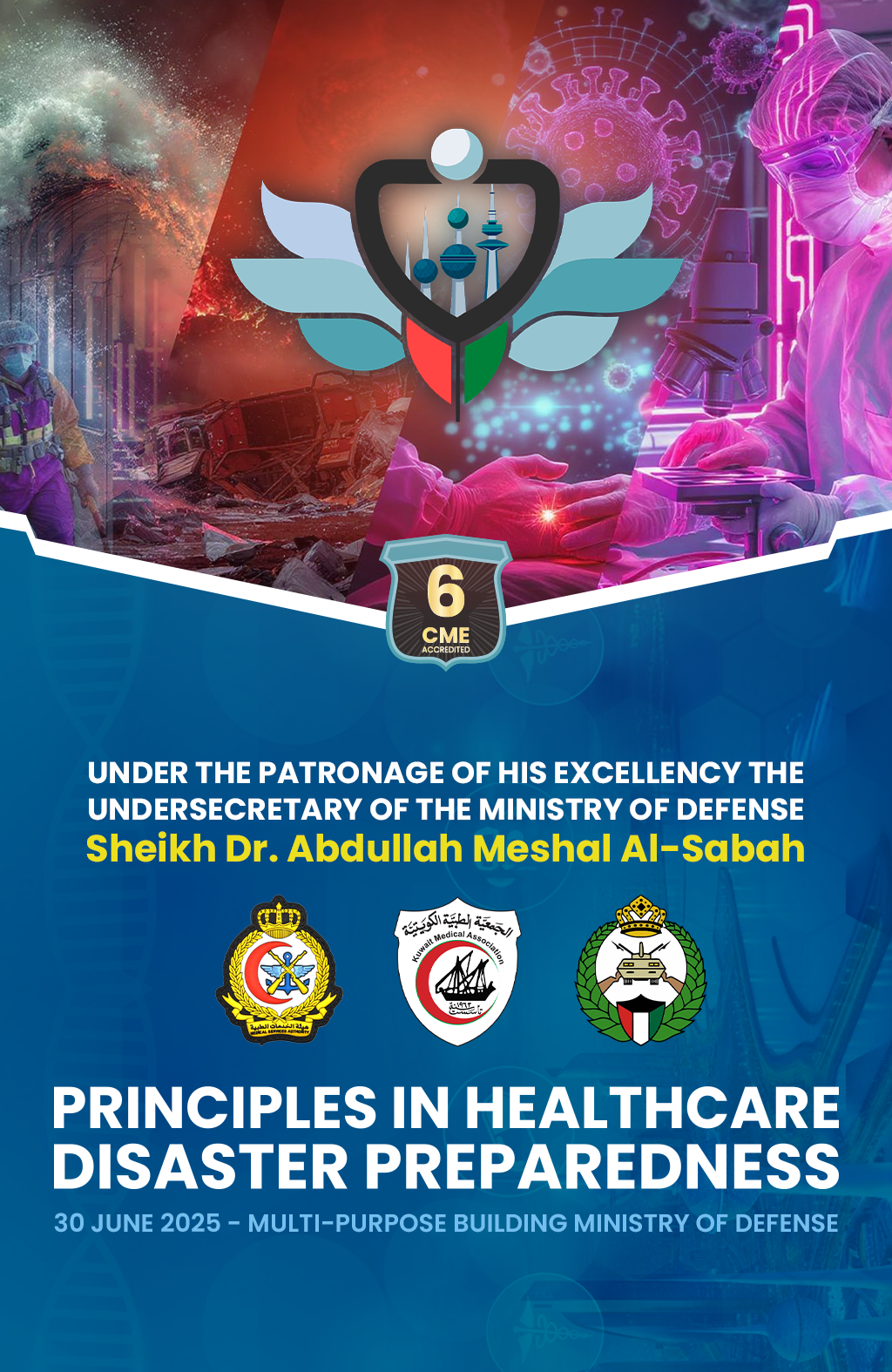 The "Principles in Healthcare Disaster Preparedness" conference is a focused scientific event organized by the Kuwait Medical Association (KMA), in collaboration with the Ministry of Defense and the National Guard, to strengthen the readiness of healthcare systems in the face of emergencies and disasters.